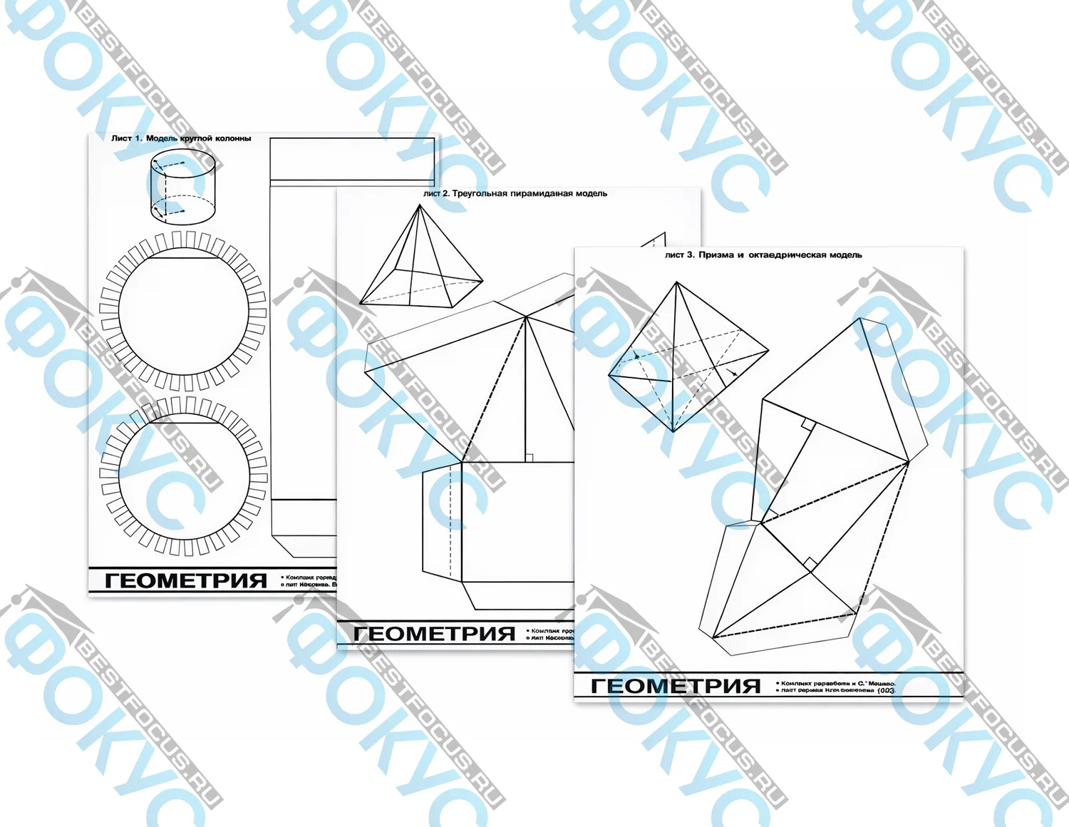 Модели собираются в пространственные фигуры, поэтому учащиеся не просто изучают схему на бумаге, а видят итоговую форму в объеме. Кроме того, каждая фигура представлена в полном виде и в варианте, разрезанном на две части секущей плоскостью. Это особенно полезно при изучении сечений и построении пространственных представлений.
