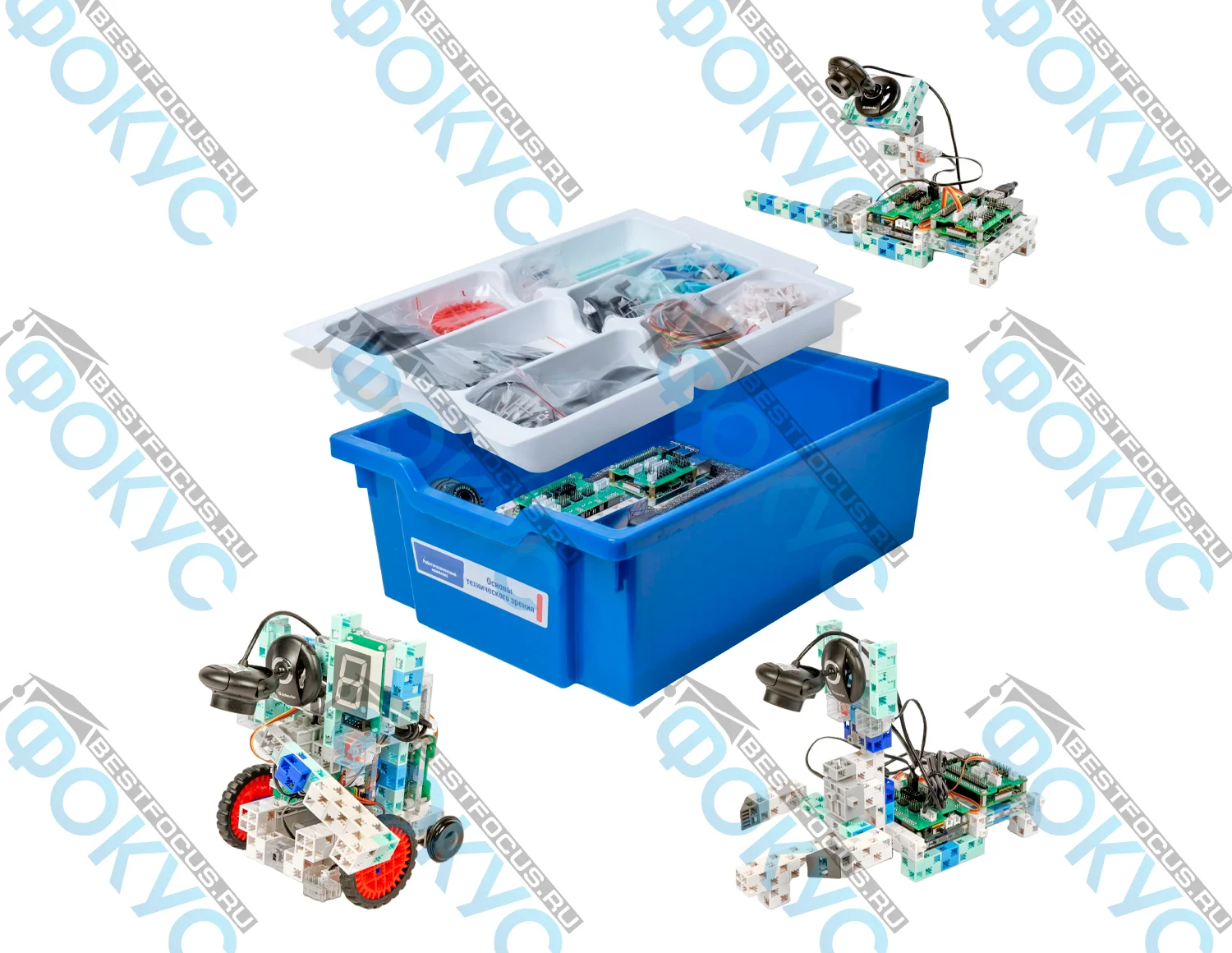 Комплектация: Arduino-совместимая платформа с аккумуляторным блоком – 1 шт, блок питания – 1 шт, моторы – 2 шт, сервомотор – 1 шт, комплект кабелей – 1 шт, конструктивные элементы – 1 комплект, светодиоды – 2 шт, ИК-датчики – 2 шт, сенсорный датчик – 1 шт, индикаторы – 2 шт, светодиодная матрица – 1 шт, дисплей – 1 шт, микрокомпьютер – 1 шт, веб-камера – 1 шт, программный модуль – 1 шт, методические материалы – 1 шт, система хранения – 1 шт.